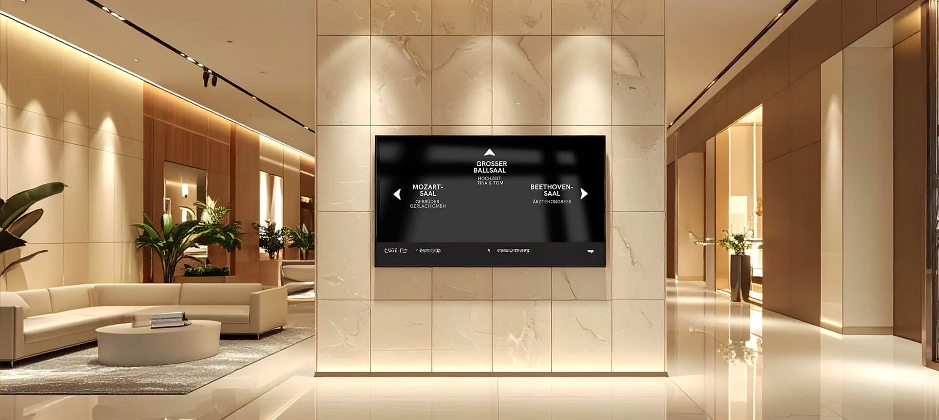 Ein Beispiel: Sie verwalten eine weitläufige Hotelanlage, und innerhalb von zwei Stunden treffen eine große Hochzeitsgesellschaft, 300 Konferenzbesucher und eine 50-köpfige Reisegruppe ein. Mit Digital Signage können Sie die Gästeströme gleich von der Lobby bzw. dem Empfang aus mit dem Namen des Events begrüßen, zum richtigen Tresen führen und weiter durch das Gelände leiten, ohne zusätzliches Personal zur Orientierung stellen zu müssen. Am nächsten Tag werden die Räume anders verteilt und Ihre Räume werden jetzt von einer Botschaft, dem Rotary-Club sowie für eine private Geburtstagsfeier gebucht. Sie stellen die Texte vom Büro aus inklusive Ansprache auf allen Schildern zentral um. So sparen Sie Zeit und Personal und bieten Ihren Gästen ein entspanntes Erlebnis und eine schnelle Orientierung.